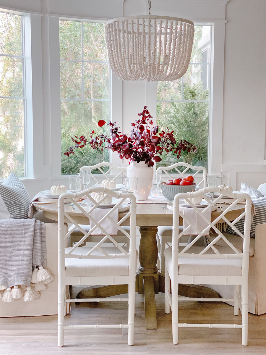 Decorating for fall doesn't have to be pumpkins galore or over the top. Here we took our little breakfast nook and cozied it up for fall with a few layers, a couple pumpkins, and of course a touch of color.