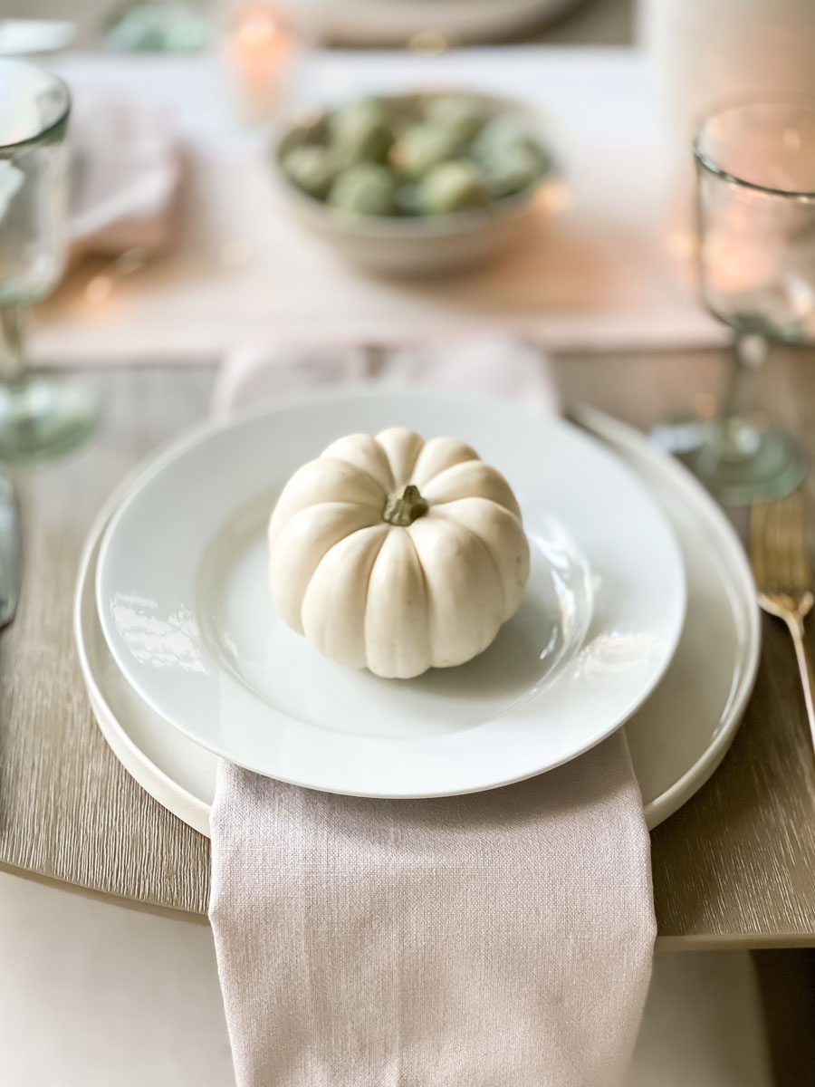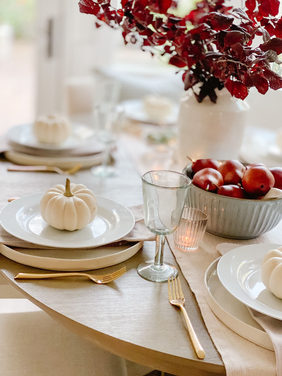 Next I added some height and dimension with my vase of fresh cut plum stems from the yard and large bowl of faux pears... I added a smaller bowl of faux sage pumpkins and then placed a simple small white pumpkin on top of each setting.